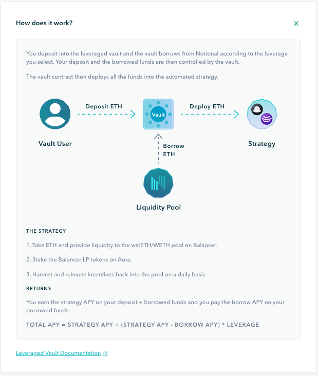 This leverage component gives you the potential for significant upside. If the yield on the vault strategy is higher than the rate you pay to borrow from Notional, you can multiply your total return!
