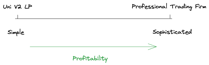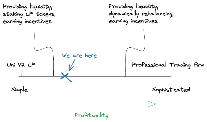 Liquidity providers sit on a spectrum of sophistication. On one end is the retail hobbyist who is passively providing ETH and USDC to a Uniswap V2 pool. On the other end is the professional trading firm who is running a highly active, automated strategy, trading on multiple venues in DeFi and CeFi and maintaining delta-neutrality across their entire portfolio.
