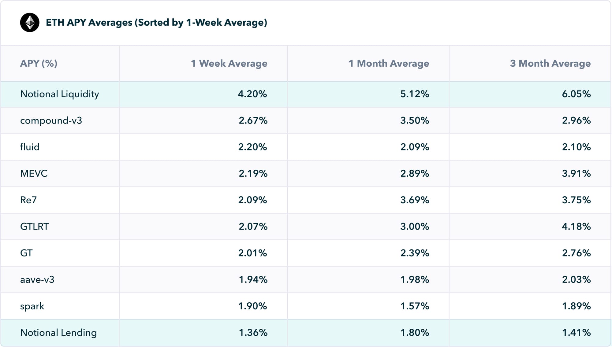 ETH Liquidity APYs: Consistently better rates on Notional than competing platforms: