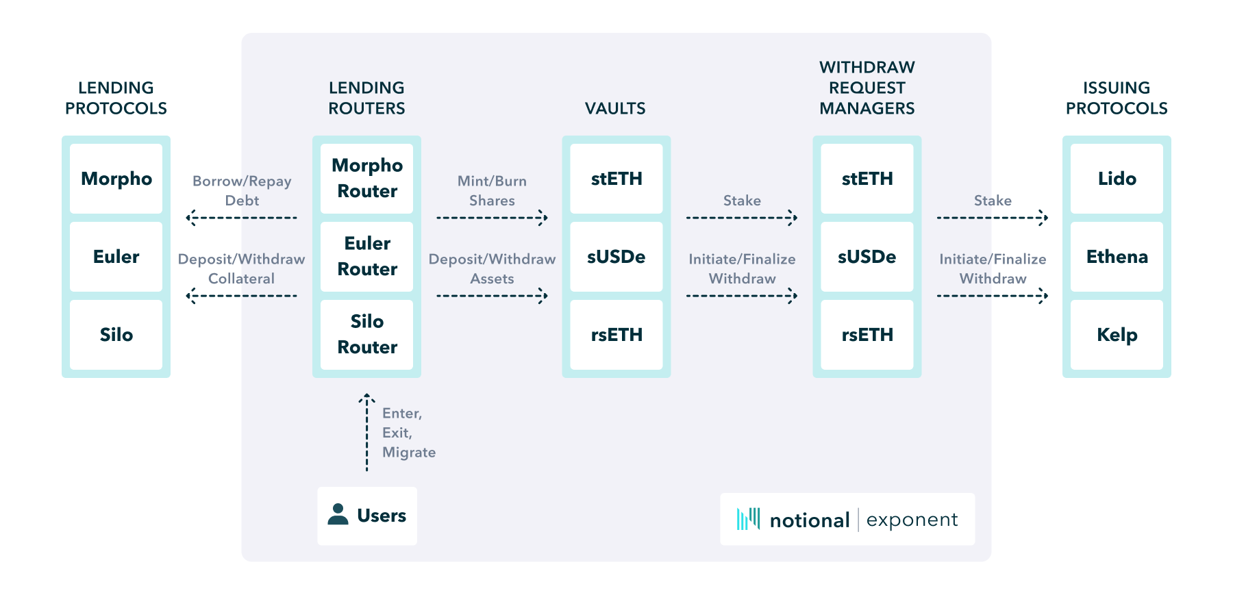 User interactions on Notional Exponent are orchestrated by three primary types of contracts - lending routers, vaults, and withdraw request managers.