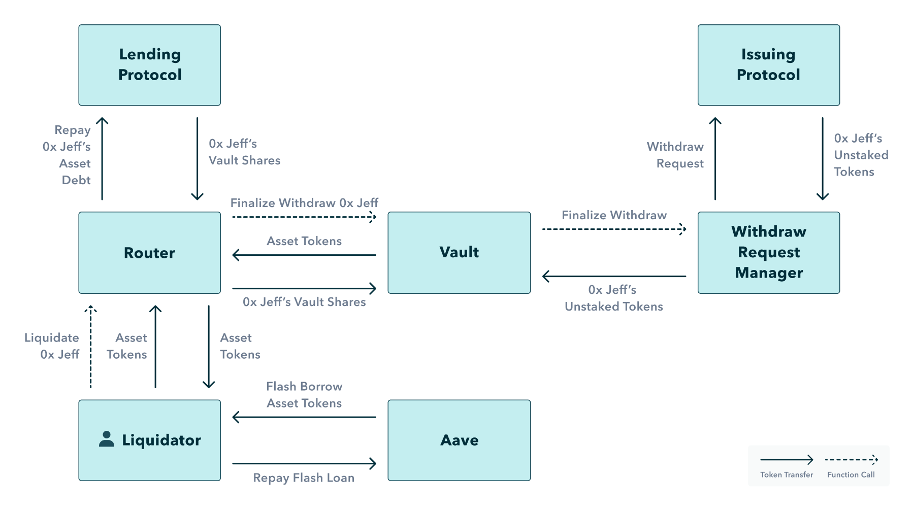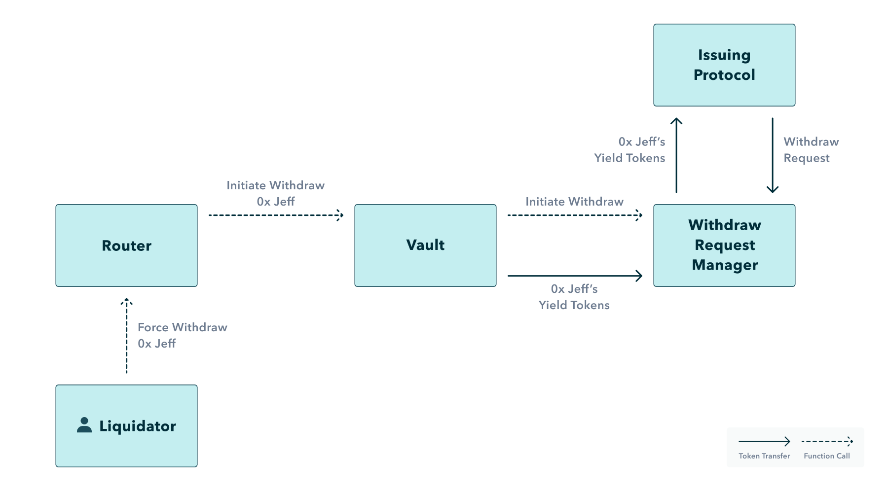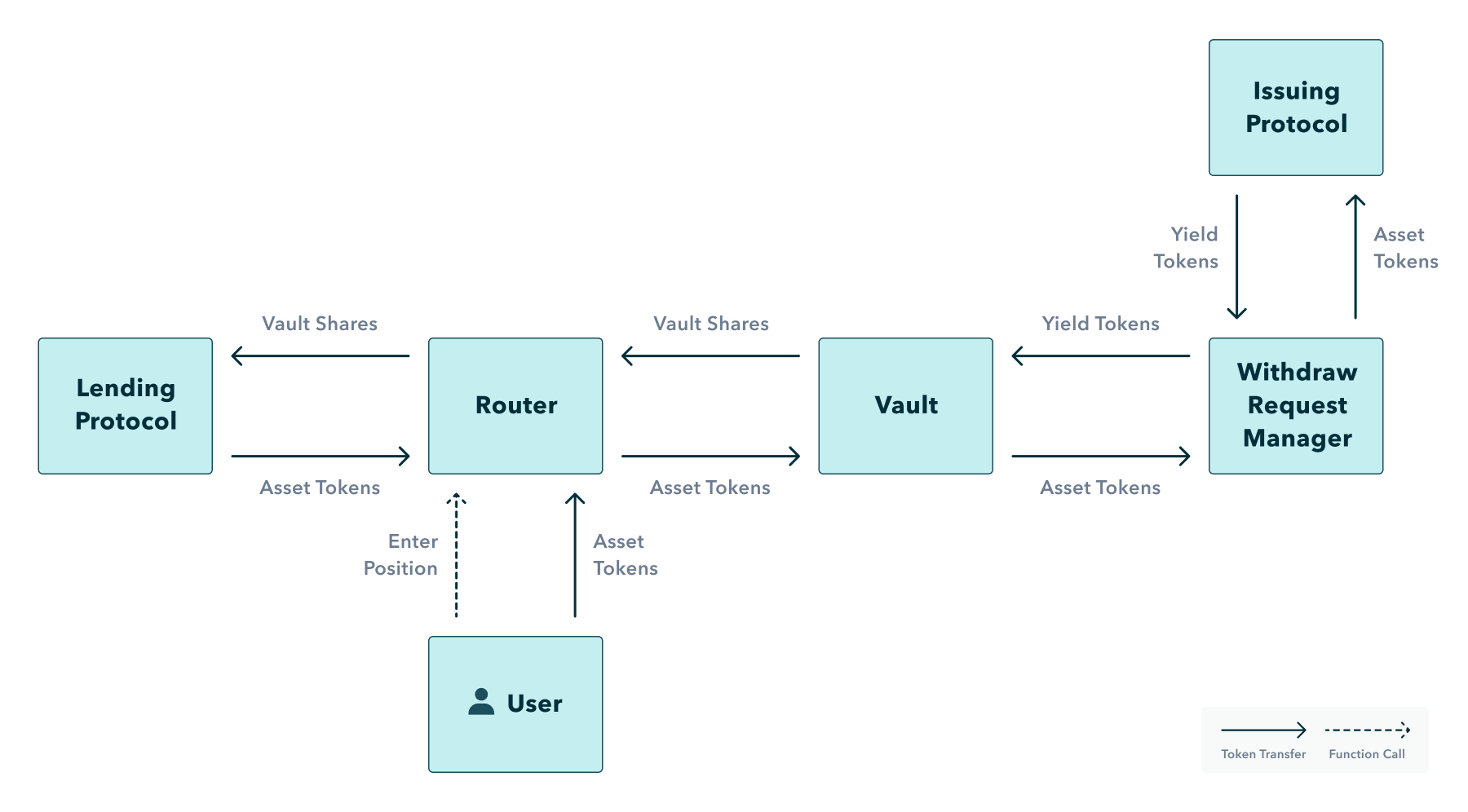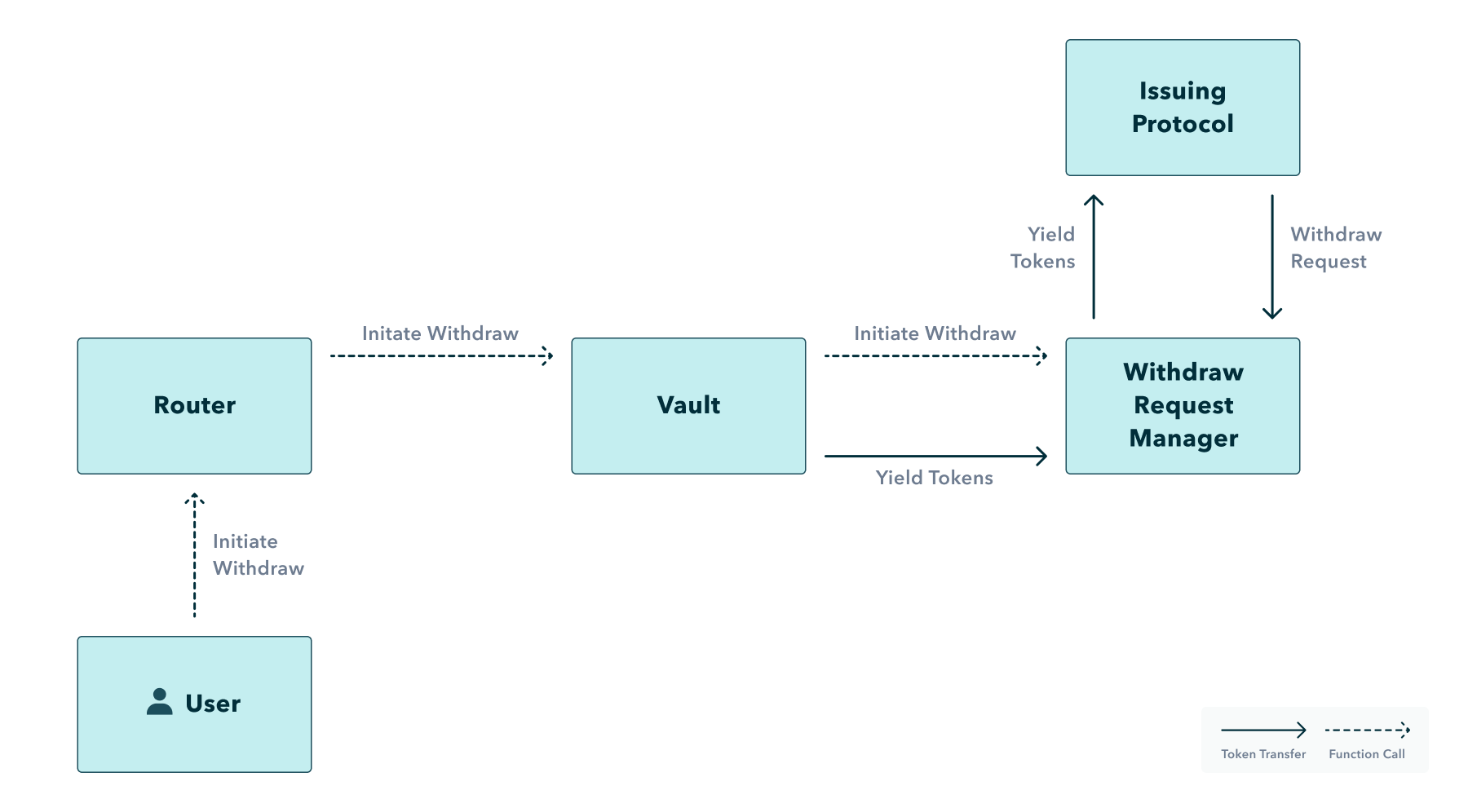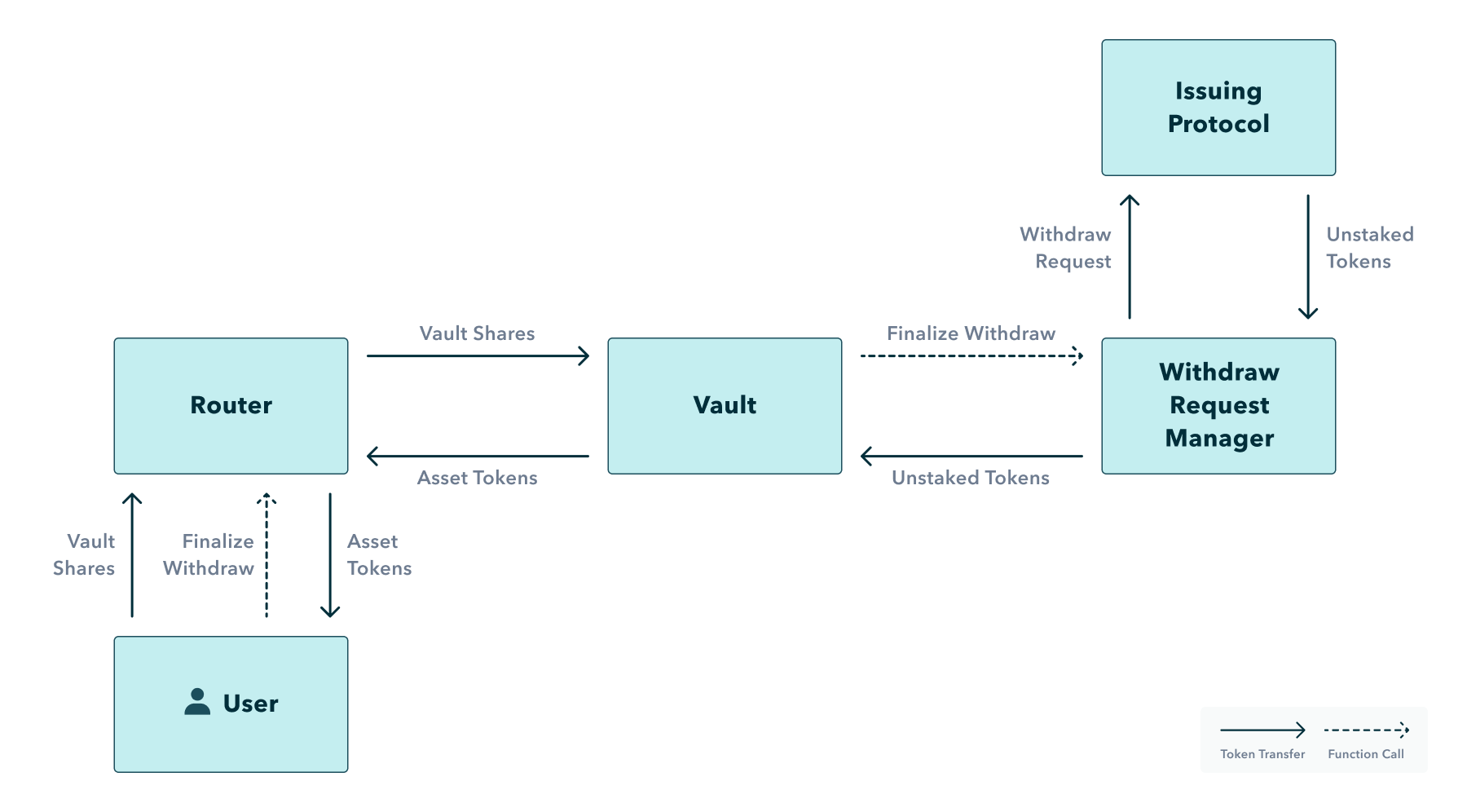 When a vault calls for staking or redeeming a specific yield token as part of a deposit or withdrawal, the vault will call that yield token’s withdraw request manager contract. The withdraw request manager will then make the correct function call on the issuing protocol and store any withdraw request information if appropriate.