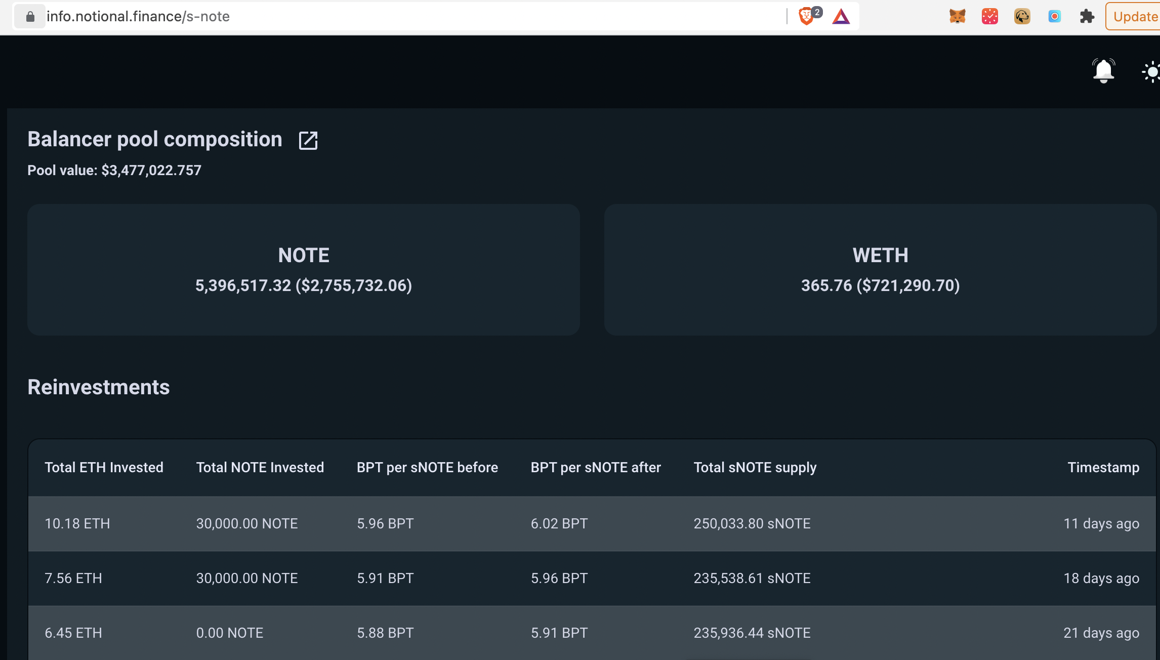 If you're not staking your $NOTE, you're missing out on your share of the reinvestments being made with protocol treasury funds. To take a look behind the scenes with the treasury and reinvestments the treasury manager is making, head over to our dashboard at info.notional.finance. Take a look: