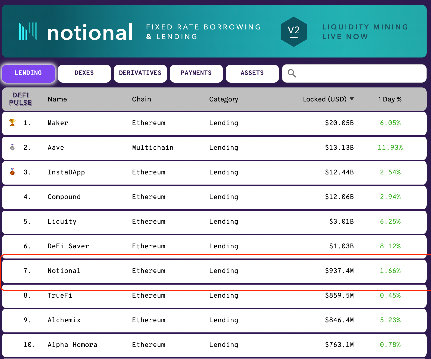 We can't thank our supporters and early users enough for believing in Notional. We are well on our way to the goal of expanding the DeFi ecosystem and use cases via a secure fixed rate protocol with deep liquidity. With more than $930M in TVL locked, Notional just catapulted into the top 10 for DeFi lending protocols in our first month post V2 launch.