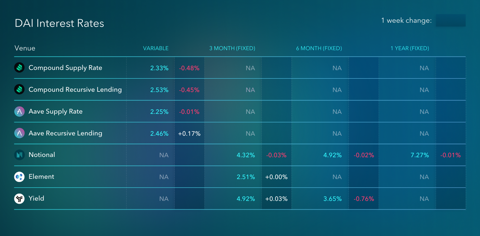 Not much movement in rates this week. DeFi rates are low and they look to be staying that way. True bear market vibes. If you can believe it, I think rates on Compound and Aave are more likely to go DOWN from here than up as the lending protocols withdraw their incentivization over the coming months.