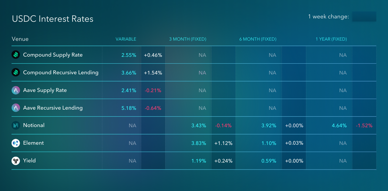 In fixed rates, the big story was that Yield Protocol listed Notional's fCash token as collateral. Now DeFi users can lend on Notional at 3%-6% and then borrow against that position at <2% on Yield to re-lend on Notional. It looks like we saw some of this activity over the last week which caused Yield's DAI rates to increase moderately. But liquidity on Yield is limited so it's difficult to put this position on in any material size at the moment.